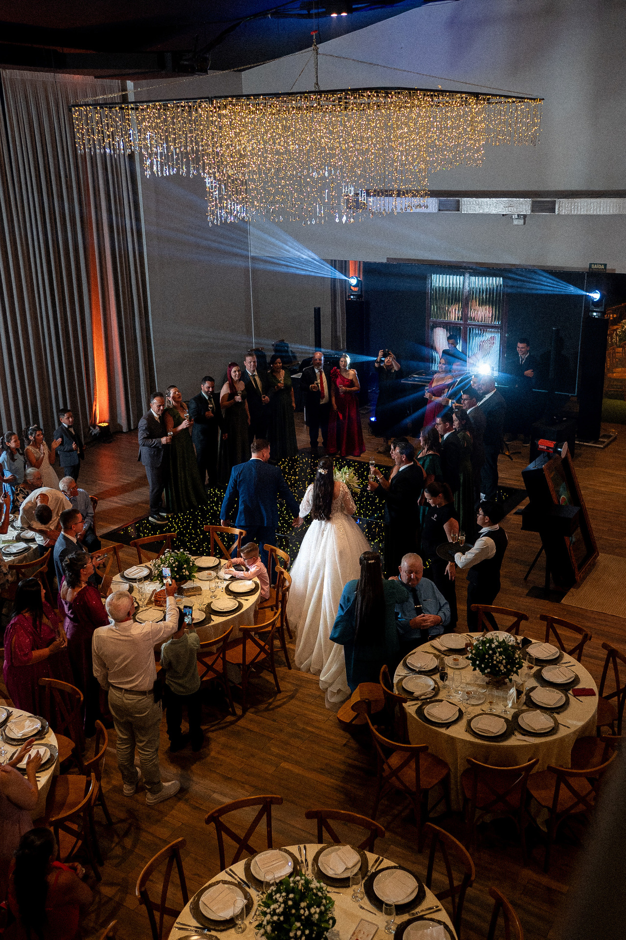 Após a cerimônia, a festa seguiu para o salão, onde o clima se transformou em alegria contagiante. Risadas, abraços demorados e uma energia acolhedora tomaram conta da noite. Era possível sentir que não se tratava apenas de uma celebração, mas do encontro de histórias, famílias e afetos.