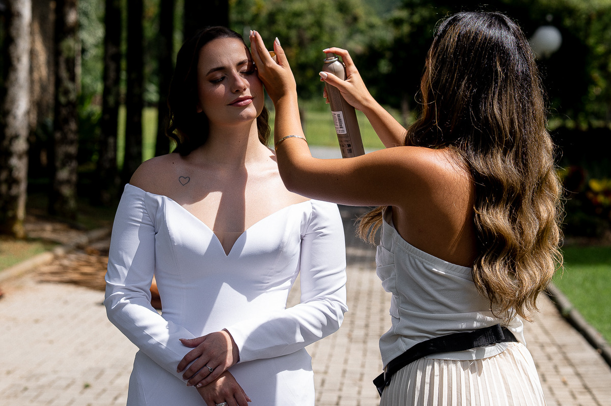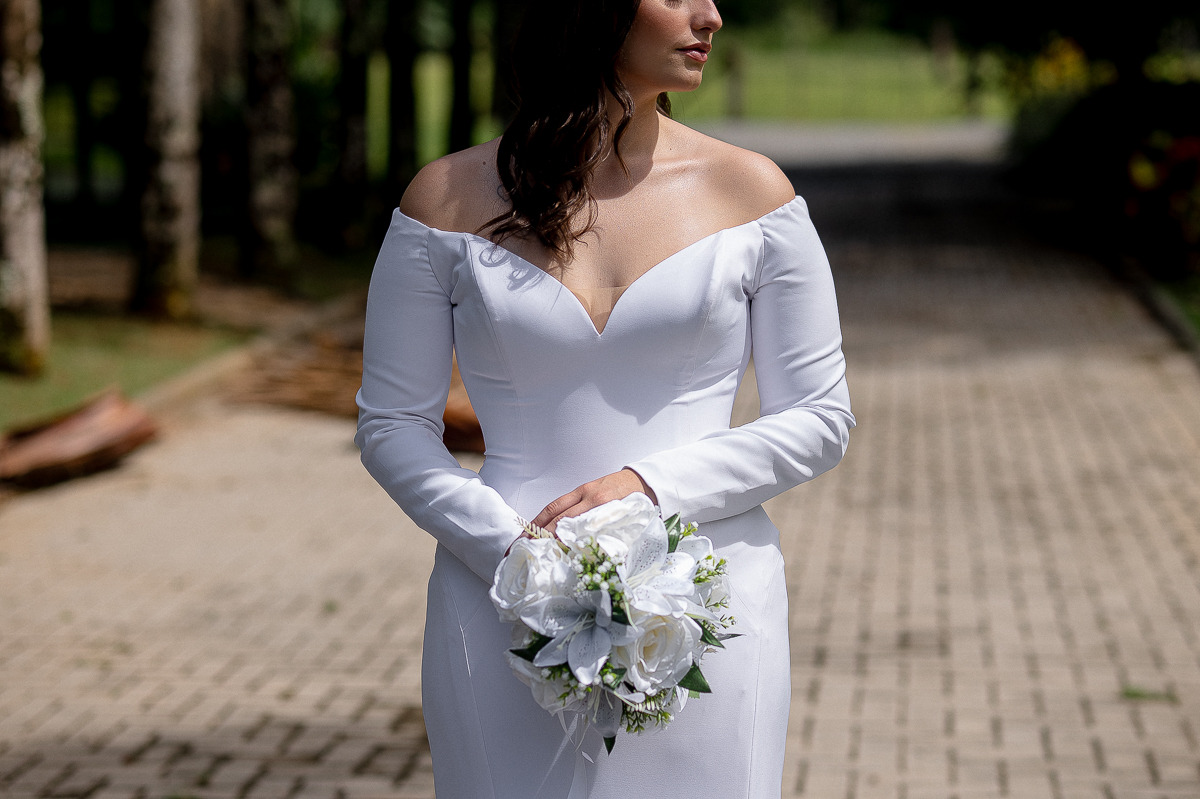 Durante o dia, tivemos a participação de profissionais que ajudaram a compor esse cenário com muito bom gosto. A produção da noiva foi realizada por Monique Pacheco, trazendo leveza e elegância para o visual. O vestido escolhido foi da Hermosa Noivas, com um estilo clássico e sofisticado que combinou perfeitamente com o ambiente do Recanto Salto II. Já o traje do noivo ficou por conta da Suits Trajes Masculinos, completando o visual do casal com elegância.