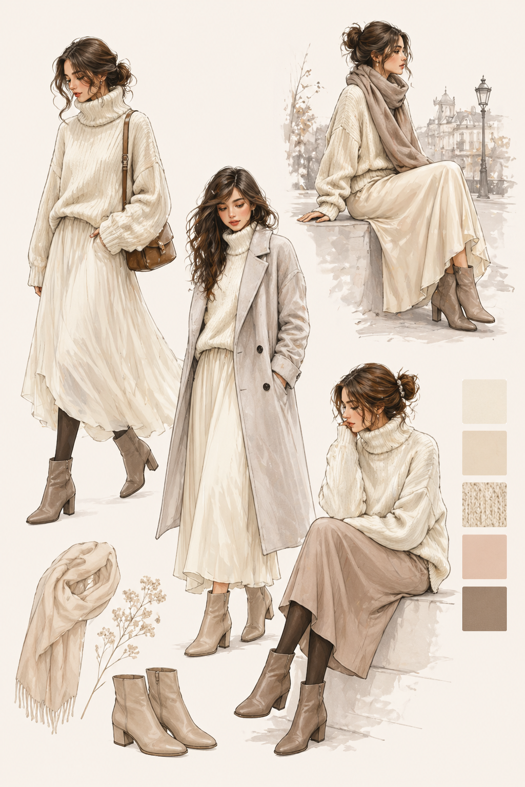 Aqui entram tricôs mais largos, tecidos fluidos, saias midi, meia-calça e botas delicadas. A proposta é construir um visual que tenha movimento, textura e conforto.